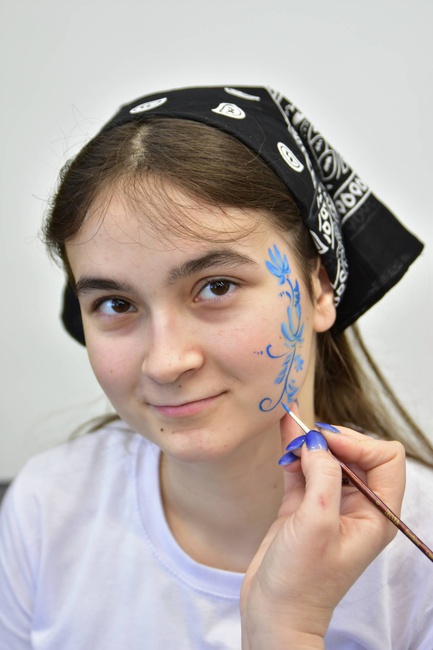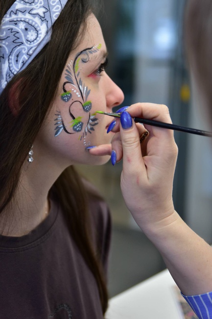 Кроме того, на площадке аквагрима талантливый художник превратил лица ребят в настоящие произведения искусства. Каждый студент мог примерить народные узоры прямо на лице, став частью живой истории.