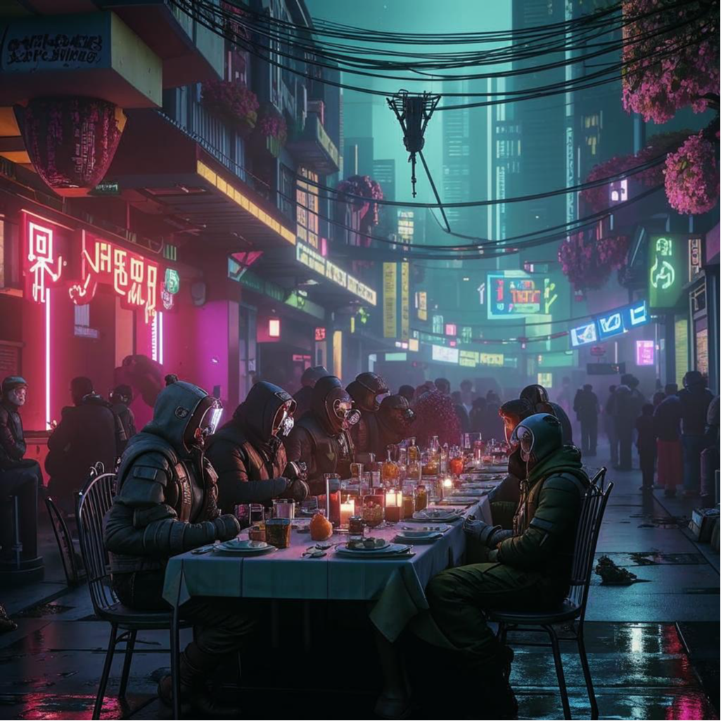 В городе чума уносит каждый день множество жизней. А несколько человек за столом прямо на улице пируют, поют песни.