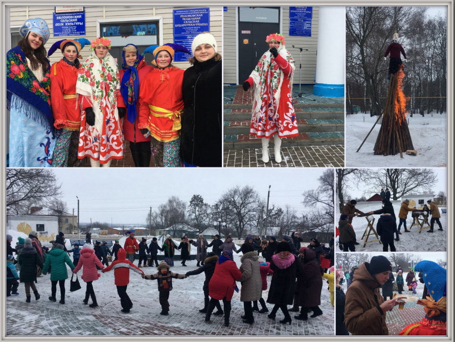 А в Яблоново жители и гости села собрались на площади перед Яблоновским СДК, чтобы дружно и весело проводить Зиму. Залихватские скоморохи (Марина Сергеева и Александр Соловьев) вместе с Забавой (Анна Коротких) быстро организовали праздничный большой хоровод. Молодые люди пилили и кололи дрова, а толпа поддерживала их криками и дружными аплодисментами! Затем, самые юные участники праздника, соревнуясь командами, сложили их в поленницу. Матушка Зима (Алена Кузьмак) предложила зрителям свои конкурсы и игры: люди отгадывали загадки, поедали блины на скорость, играли в снежки, пели песни и танцевали. После того как Красавица Весна (Дарья Жоголева) приняла эстафету у Зимы, свершилось традиционное сжигание чучела. Все собравшиеся бросили в костер свои записки с желаниями, надеясь на их скоро исполнение в весенний сезон!